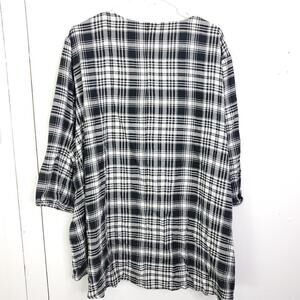 This Catherine's women's top in size 3X features a stylish ruffle front and V-neck design, making it perfect for casual, workwear, or travel occasions. The gingham plaid neutral color adds a classic touch to the blouse, while the polyester material ensures easy care with machine washability. With 3/4 sleeves and a pullover closure, this blouse offers a comfortable and regular fit for women looking for a lightweight and versatile wardrobe staple for fall and spring seasons.