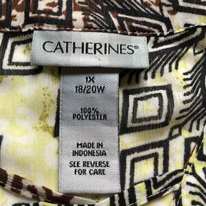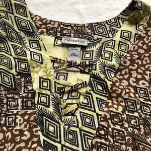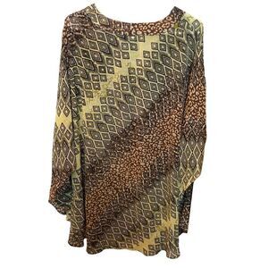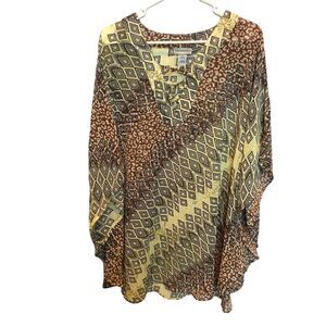 Catherines Tunic Blouse light weight, black yellow and brown print v-neck 1X