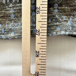 This women's blouse features a captivating blue and brown pattern with intricate lace detailing on the V-neck. Its lightweight material and short sleeves make it ideal for a refined yet comfortable look.