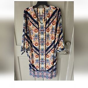 This vibrant dress features a stunning geometric print in shades of blue, orange, and cream. Perfect for any occasion, it offers a stylish and comfortable fit.