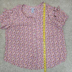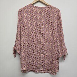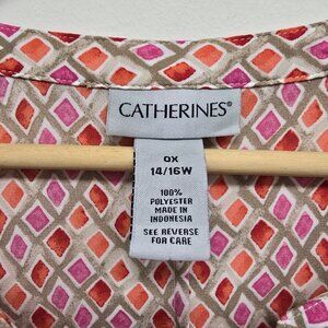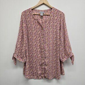 Catherines V-Neck Button Up Blouse Top Size 0X 14/16W Pink Orangr 3/4 Tie Sleeve