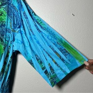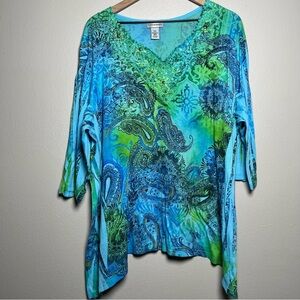 Catherines Women Top 2X Blue Green Sequins V-Neck Embroidered Share Bite Paisley