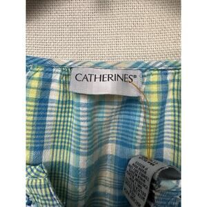 This Catherines women's blouse is a stylish and versatile piece in size 1X (18/20) with a teal blue, yellow, and white plaid design. It features a V-neckline, 3/4 roll tab sleeves, and a relaxed fit, making it suitable for various occasions such as travel, parties, workwear, and casual wear. Made from 100% cotton woven fabric, this lightweight tunic is ideal for all seasons and is machine washable for easy care. With button accents and embroidered details, this top exudes a designer boho chic vibe perfect for spring and summer styling.