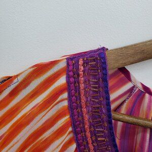 • Multicolor striped print in orange, purple, and pink tones
