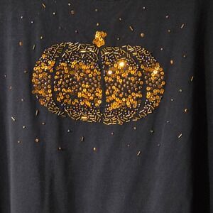 Festive top for seasonal flair: A black, plus-size top from Catherines, featuring a striking pumpkin design crafted from gold-toned sequins and beads. This eye-catching embellishment adds a touch of sparkle and holiday cheer. The shirt has a comfortable scoop neck and relaxed three-quarter sleeves for a flattering fit. It is ideal for casual autumn gatherings, Halloween parties, or adding a festive touch to everyday wear.