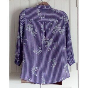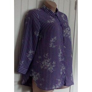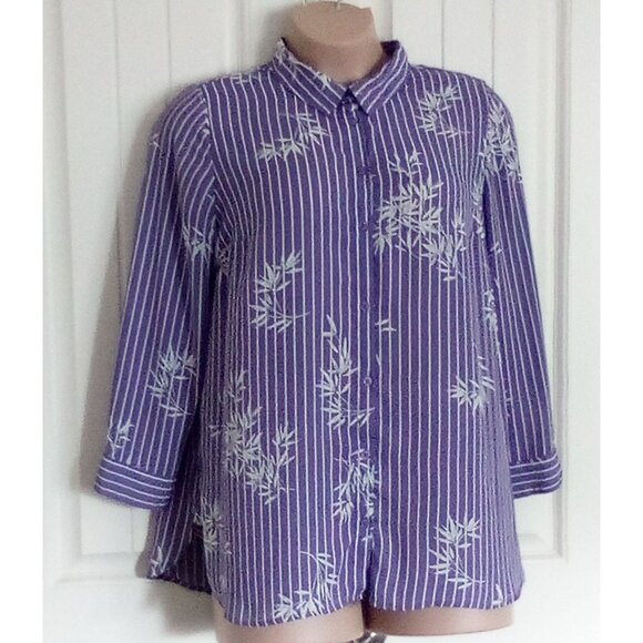 This chic Catherines Women's Blouse in size 0X features a striking purple and white bamboo print. The long sleeve button-down design is made from comfortable polyester, perfect for adding a pop of color to any outfit.