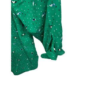 A lightweight and vibrant blouse featuring a playful umbrella pattern on green fabric. Designed with a button-front closure, 3/4 sleeves with ties, and relaxed silhouette.