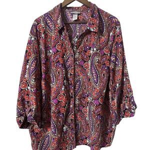 Catherines Women's Long Sleeve Button Up Collared Top Paisley Plus Size 2X 22/24