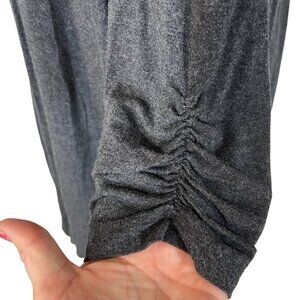 A chic and versatile Catherine's cardigan,designed with a stylish open front, asymmetrical hem, ruched sleeves and longer length for added coverage. Comes in a neutral gray color.