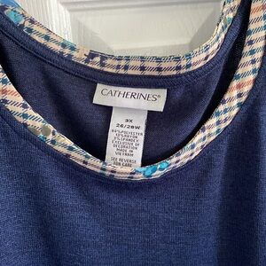 Catherine's Womens Plus Size 3X 26/28 Blue Knit Floral Plaid Trim Top 3/4 Sleeve