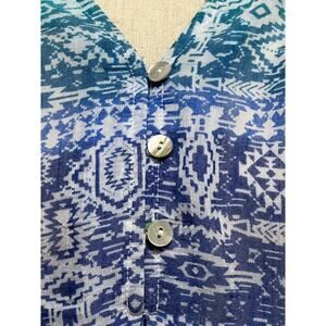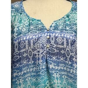 mocking and a flirty notch neckline with three-button pleated placket., 3/4 sleeves, loose, semi-sheer , Aztec print , southwestern print, lighweight ,