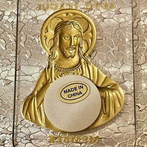 🔸 Jesus Sacred Heart Plaque – gold-tone image of Jesus with radiant Sacred Heart, encased in clear acrylic…. Good for car