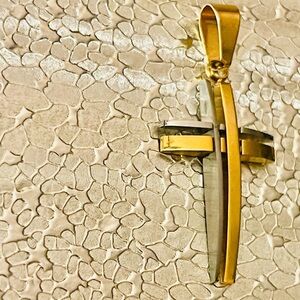 🔸 Two-Tone Cross Pendant – stylish modern design in gold and silver tones; metal construction with loop for chain.