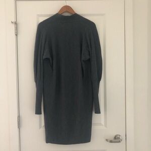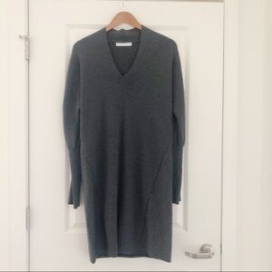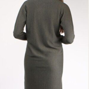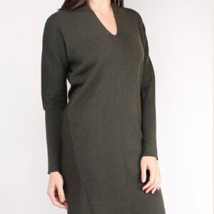 A classic knitted v-neck dress with two front panel seams and fitted ribbed sleeves. Army green/gray