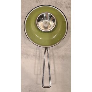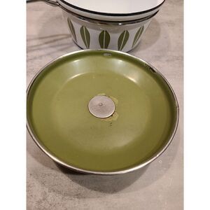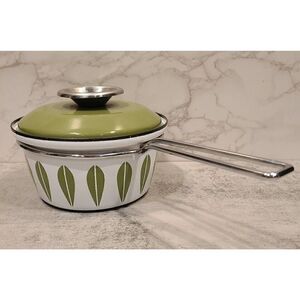 Cathrineholm Lotus Green & White Small Enamel Sauce Pot/Pan With Lid | Metal Handle Mid-Century Modern 50s/60s | Previously Loved Condition | *Flaw there are some surface cratches on the outside enamel. The Metal Lid nob spins around but still works as it should | The lid has more wear and light rust. | The metal hardware is a little bent however, still serves it's purpose | Please refer to ALL the photos for the condition | 4.25" with lid 6.25" wide | Total length with handle 11.5" | Weight before packaging 1.13 lbs.