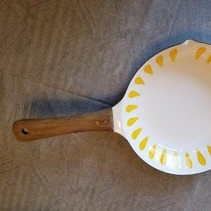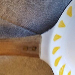 Cathrineholm of Norway Enameled 9” Yellow and White Lotus Pattern Sauté Skillet Frying Pan With a Wooden Handle.