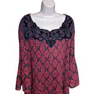 This Cathrines womens blouse in size 4X features a beautiful floral pattern on a black and red background. The smock style top is enhanced with bell and flare sleeves, and velvet trim adds a luxurious touch. Made from polyester for comfortable wear.