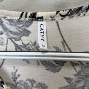 Elevate your wardrobe with this stunning Cathy cream and black floral top. The relaxed-fit tunic blouse features a V-neckline and short sleeves, making it perfect for travel or casual occasions. The lightweight and breathable knit fabric, made of spandex and rayon, ensures a comfortable fit all year round.