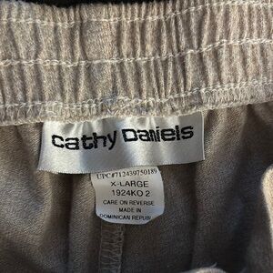 Stylish beige capris by Cathy Daniels. Features a studded hem for added flair. Comfortable and chic.