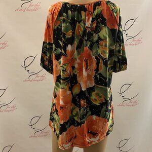 Cathy Daniels. Size Medium. Peasant Sequin Embellished Pullover Top. Relaxed fit. Elastic sleeve. Poly/spandex. Stretch. Side slits. Center back 24.6". Sleeve 10.6". Bust 40". Excellent pre-loved condition. No spots, tears or damage.