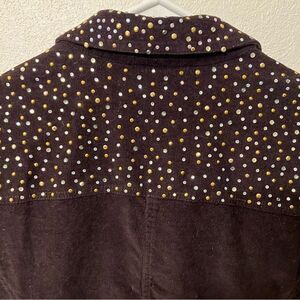 This item is brown western style cordero jacket from Cathy Daniels. The item’s top is covered with rinestone studs. The front and cuffs are snaps. The jacket is made out of 97% cotton and 3% spandex. The size is XL. The measurements are 23” L x 23” W (pit to pit) x 23” sleeve (shoulder to cuff). This jacket has been gently worn but is in very good condition.