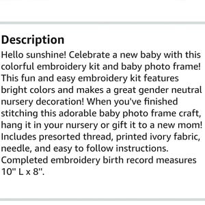 Cathy Heck embroidery kit. Welcome a new baby with a birth announcement kit. Gender neutral, contains all items to create a hand stiched birth announcement. Baby's photo and frame not included. When finished, fits standard 8 by 10 frame.