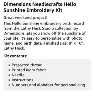 Cathy Heck Hello Sunshine Birth Announcement Embroidery Kit