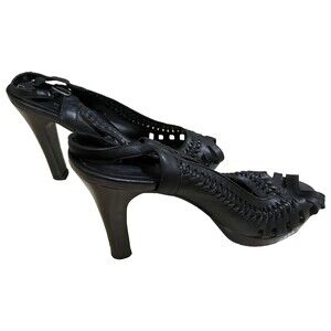 Cathy Jean Black Open Toe Block 4in Heels Shoes Braided Leather Strappy Sandal Women's Size 7