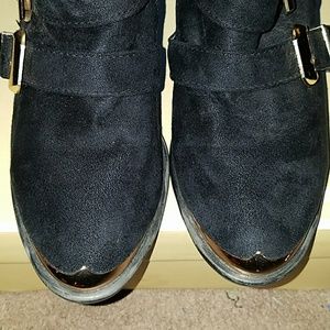 Black suede botties with gold hooks on the side & gold tip. Very chic! Only worn once. Heel is about 2 inches tall. New condition. Open to offers! Any questions feel free to ask. --last 2 photos were taken with flash.