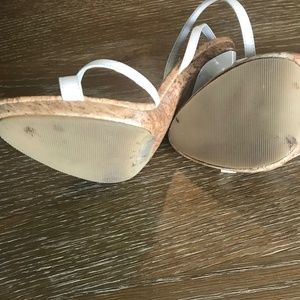 White & Cork Strappy Heels / Adjustable Ankle Strap / Used Condition / Wear on Soles and Scratches Around Shoes / Please see photos for more detail on worn condition on front and sides / Approx. 4" Heel / Size: USA 7