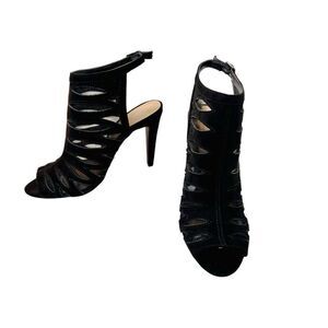 Cathy Jean Strappy Black Heel Stiletto Shoe Velvety See-through Open Toe sz 6. Great Strappy heels with ankle strap. Netting between straps. Worn a couple of times. Heel height 3". Item in excellent gently used condition. No known rips, tears, holes, stains or defects.
