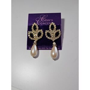 Cathy's Concepts Gold Tone Faux Pearl Black Rhinestone Dangling Earrings