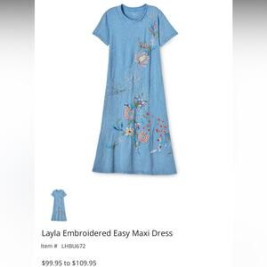 So much to love about this dress-the casual washed blue color, the gorgeous floral embroidery and the way it flows, with a flared hem thanks to an extra panel on the side. It's an easy-fit, pullover dress with artsy style to spare. 100% cotton. Machine wash. Imported. S (4-6), M (8-10), L (12-14), XL (14-16), 1X (18-20), 2X (20-22), 3X (22-24). M hangs 50".