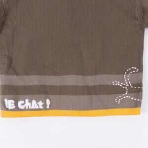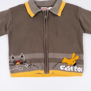 This is a long sleeve, zip cardigan by Catimini in brown with an almost greenish undertone and contrast marigold yellow trim. Features an embroidered cat and bunny or dog and the French phrases, "C'est toi le chat!" along back and front of sweater.