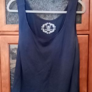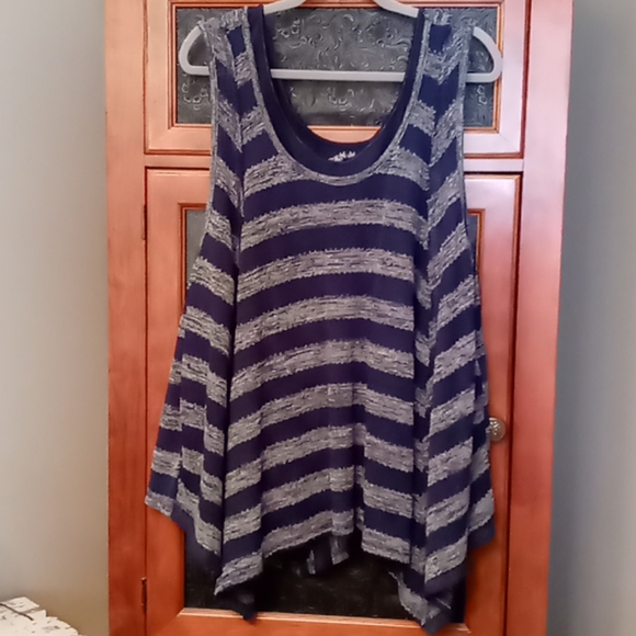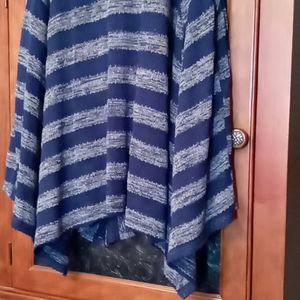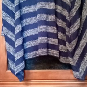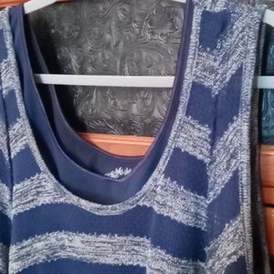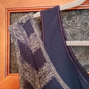 Beautiful in blue! This fun swing top sweater is roomy and sassy! It is actually two separate pieces. The tank top shell is solid navy blue. The outer sleeveless sweater is a stripe pattern.