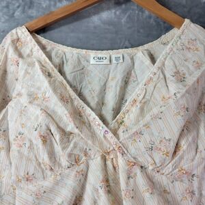 Lightweight floral babydoll blouse in size 18/20W. Features an empire waist, tie front detail, short sleeves, and a soft pastel print. Flowy and flattering fit, perfect for romantic or cottagecore-inspired looks.
