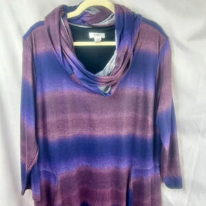 This Cato A-line dress in size 24 is perfect for work and beyond. The purple stripe, stretch material, and attached infinity scarf add a touch of elegance. Its midi-length, long sleeves, and pullover design make it a versatile addition to any woman's wardrobe.