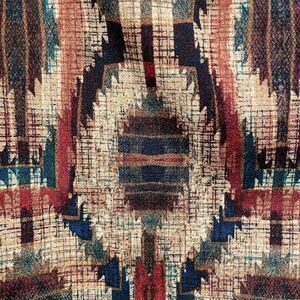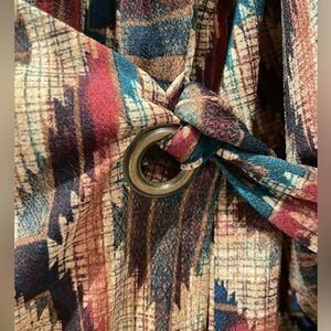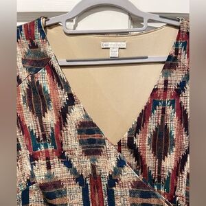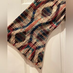 Cato tan, blue and burgundy retro abstract patterned wrap dress. With 3/4 length Bell sleeves in a wrap style with tie at left side. Fully Lined. No flaws. Smoke free, dog friendly home.