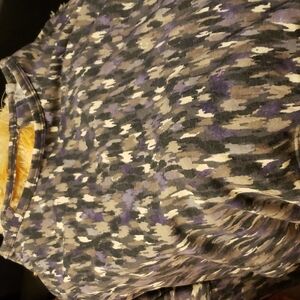 Cato Activewear sweatshirt. Looking for a great piece for after a work out or lounging at home? This sweatshirt may be the one for you! Purple and gray pattern that has an open back. the crewneck has a string back with a cross detail at the waist. Flattering dolman sleeves. 60/40 cotton poly blend for easy care.