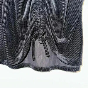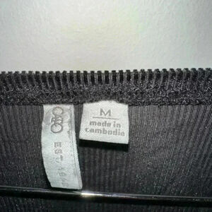 This is a black, long-sleeved, velvet top with a square neckline and a drawstring at the front. The top is made of a soft, stretchy fabric and has a slightly loose fit. It is in good condition with no visible signs of wear or damage. The top is size M and is made in Cambodia. The top has a slight sheen to it, giving it a more formal look. The drawstring is functional and can be adjusted to create different looks. The top is a versatile piece that can be dressed up or down.