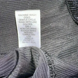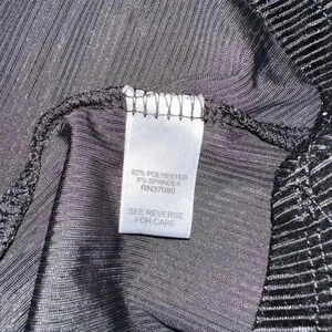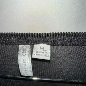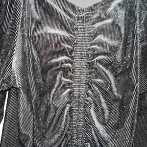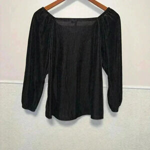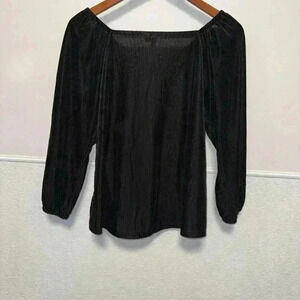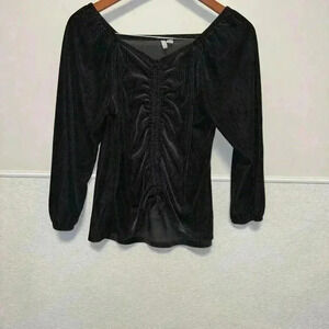 This is a black, long-sleeved, velvet top with a square neckline and a drawstring at the front. The top is made of a soft, stretchy fabric and has a slightly loose fit. It is in good condition with no visible signs of wear or damage. The top is size M and is made in Cambodia. The top has a slight sheen to it, giving it a more formal look. The drawstring is functional and can be adjusted to create different looks. The top is a versatile piece that can be dressed up or down.