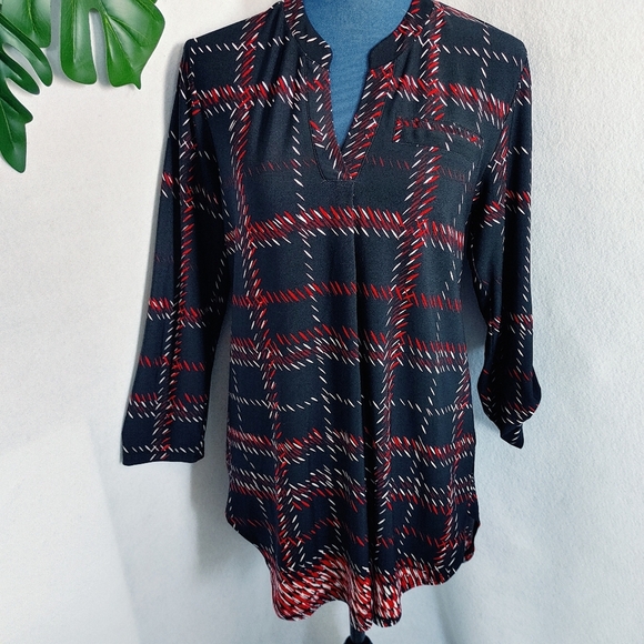 Cute tunic top Black and red plaid design By Cato Size M Sleeves can be worn button up or down Measures 19" across chest 34" in length Preowned