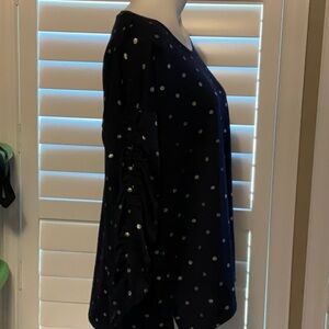 This stylish black and silver blouse from Cato showcases a subtle sheen and slightly gathered sleeves, making it a versatile addition to any wardrobe.