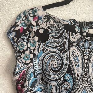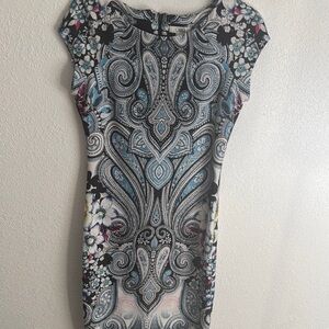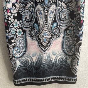 Chic mini dress with intricate floral patterns. Features a blend of blue and black hues. Perfect for stylish outings.