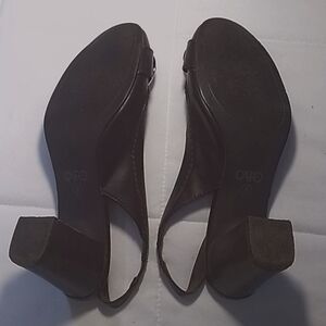 Dark brown sandals with silver buckle and elastic on back strap for easy slip on. See photo 3. They have a 3" heel and are in great used condition.