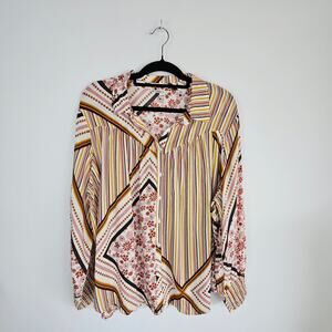 Cato Button Up Long Sleep Mixed Print Stripe Floral Hippie 70s Top Blouse XL