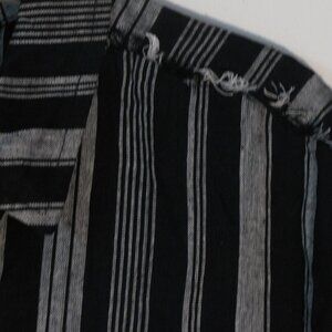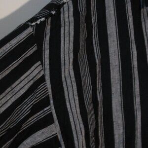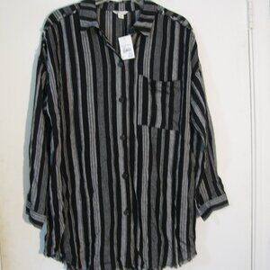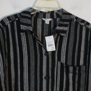 Cato button up shirt in size medium. New with tags, this long sleeve blouse retails for $44. Black and gray stripes with one breast pocket and button cuffs. Raw edge eyelash trim on the shoulders and hem. Super nice quality, made from 74% rayon and 26% linen, machine wash.