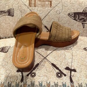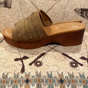 Questions in comments. The "Cato C est 1946 Comfort" wedge sandal features a suede-look, fringed upper and a wood-effect 2-inch heel. It is a slide-on style with a cushioned insole for comfort. Step into comfort with these stylish slide sandals. Perfect for any casual outing. Good condition size 9M