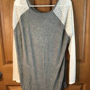 Cato Grey shirt with white lace sleeves, XL scoop neck, bottom sides have bunching, Body 94% Rayon 6% Spandex Sleeves 65% Polyester