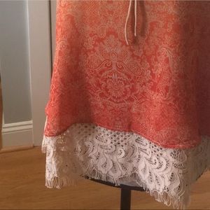 Cato Casual/dressy Spaghetti strap top that has a tan lace design at the bottom, has a darker orange fading to a light orange paisley print. Top is 100% polyester the lace is 51% nylon and 49% cotton and the lining is 100% polyester. Size 14-16 W. NWT